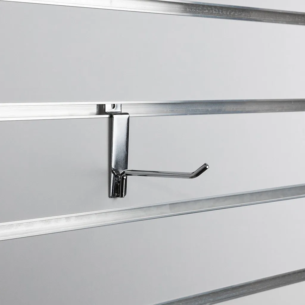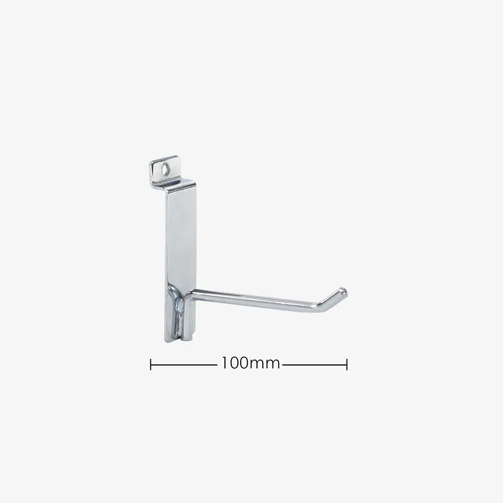 100mm heavy duty drop down chrome dipped slat wall hook, suitable for all major slatwalls, 6mm diameter with three spotwelds for support this hook will not let you down. Stylish and strong you will be proud to display your products on these slatwall hooks.