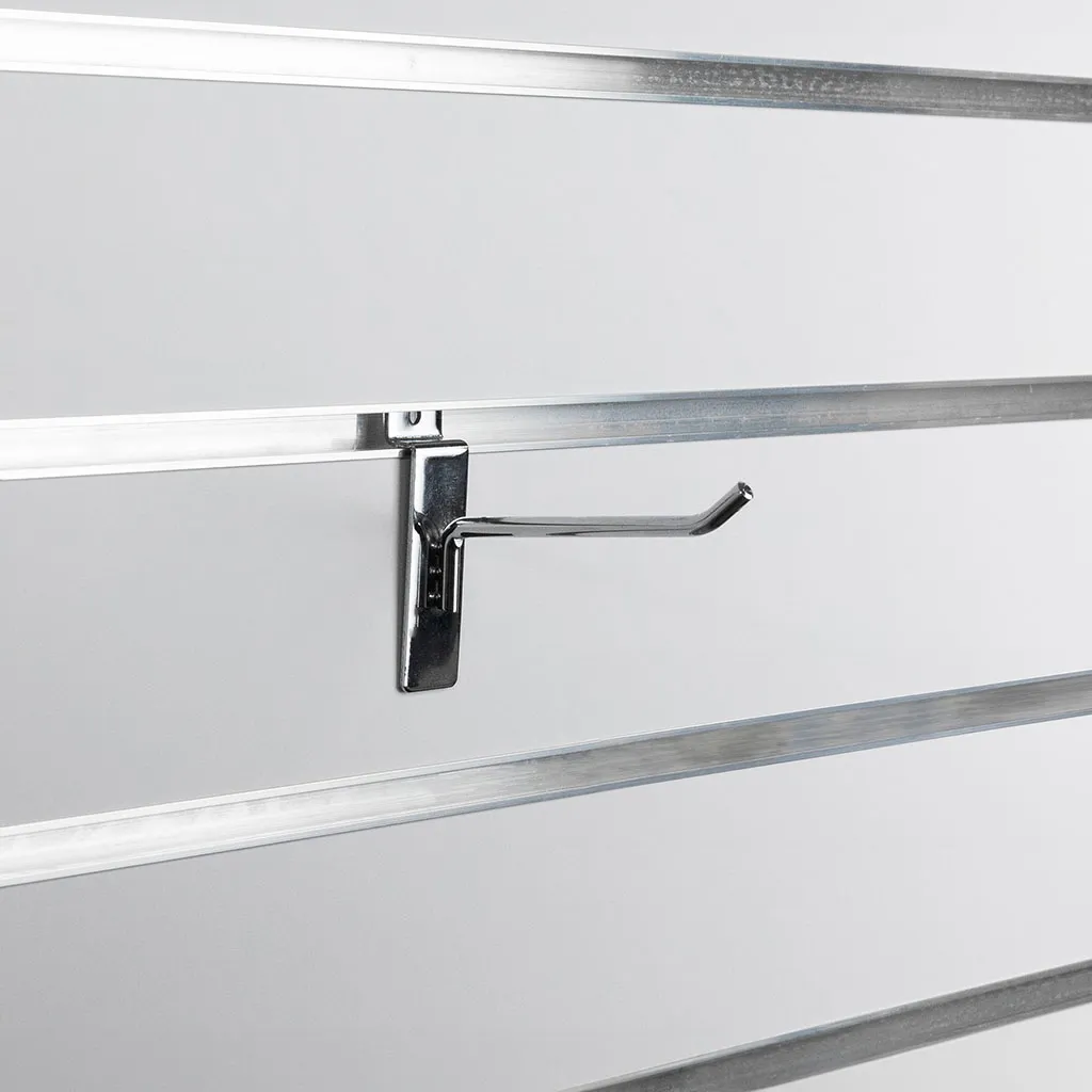 100mm heavy duty chrome dipped slat wall hook, suitable for all major slatwalls, 6mm diameter with three spotwelds for support this hook will not let you down. Stylish and strong you will be proud to display your products on these slatwall hooks.