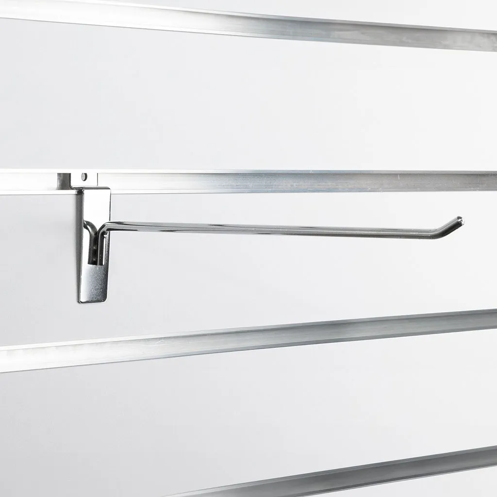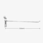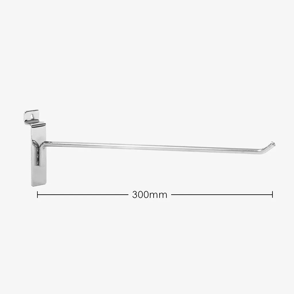 300mm heavy duty chrome dipped slat wall hook, suitable for all major slatwalls, 6mm diameter with three spotwelds for support this hook will not let you down. Stylish and strong you will be proud to display your products on these slatwall hooks.