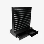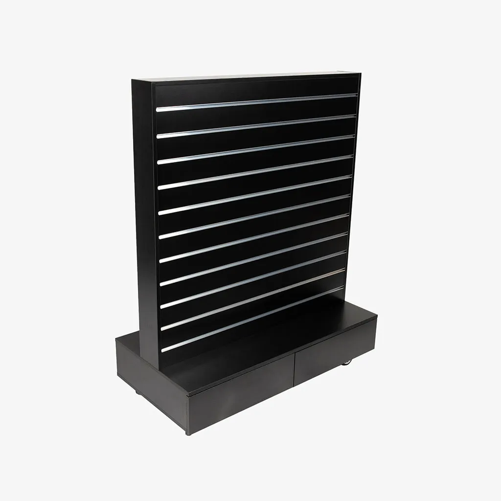 Upgrade your retail space with our superior-quality slatwall gondola shelving, a versatile and durable solution designed to enhance your store’s functionality and aesthetic appeal. Our gondola units, featuring a robust 150mm frame and equipped with four lockable castor wheels for ease of movement, are an indispensable addition to any retail setup. Crafted to facilitate seamless integration, our black center slatwall gondolas are outfitted with drawers for additional storage and slat walls with 100mm spaced grooves, allowing for customizable display options to showcase your products effectively.