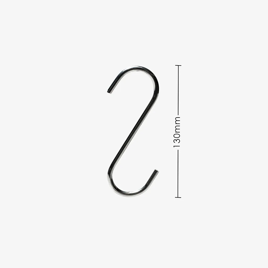This extra small chrome S hook is sold in packs of 10. The measurement for the small S hook is 130mm H x 92mm W and 6mm in diameter with a 30mm internal space.