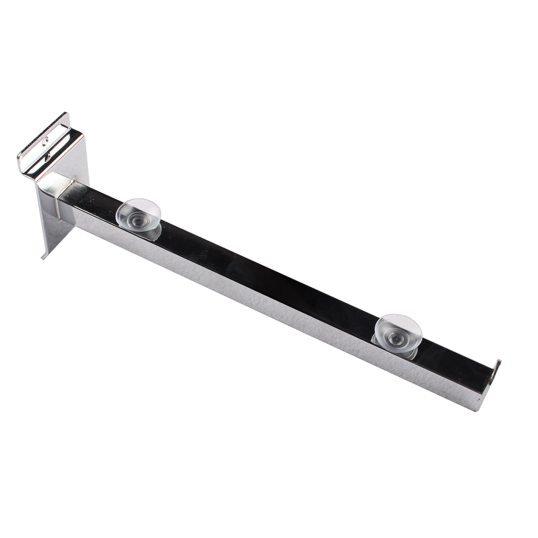 300mm slat wall chrome straight display arm/bracket with suction cups suitable for glass, wooden shelves or used with clothes hangers