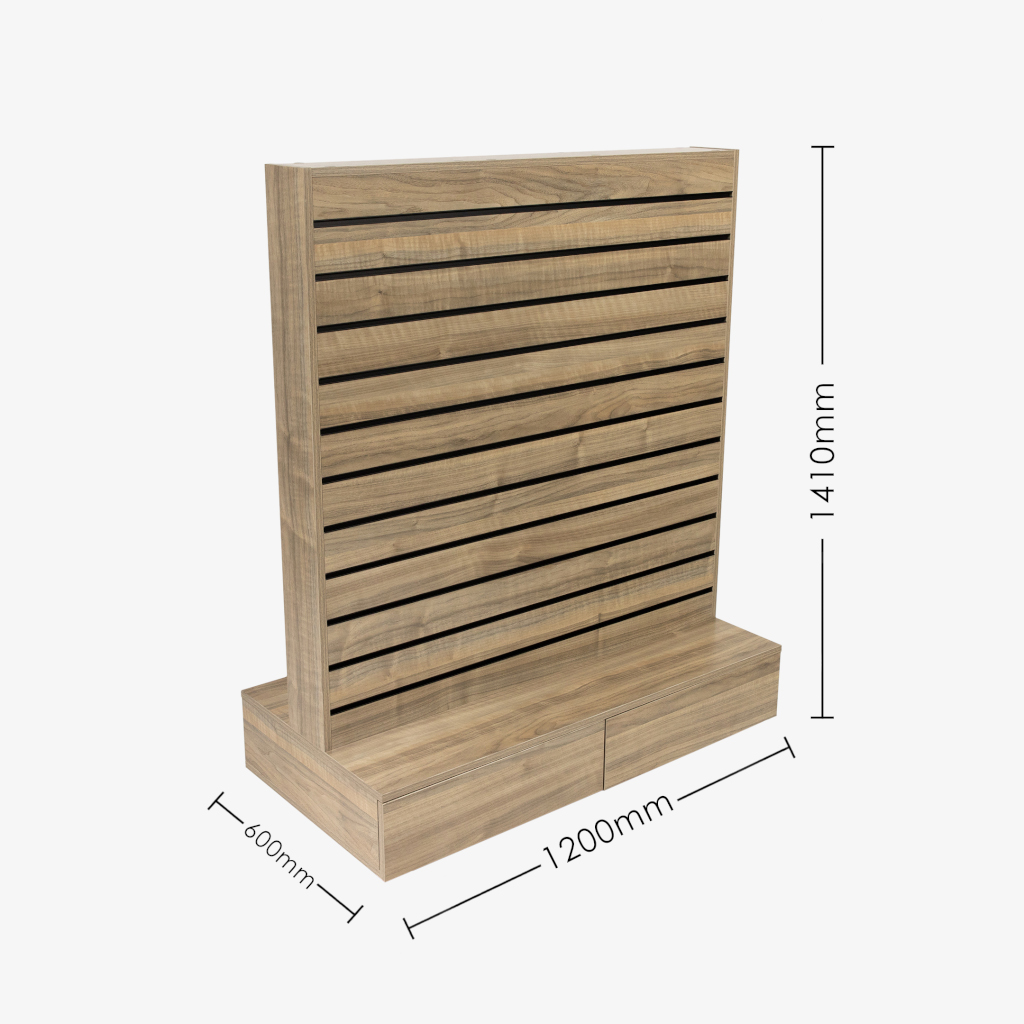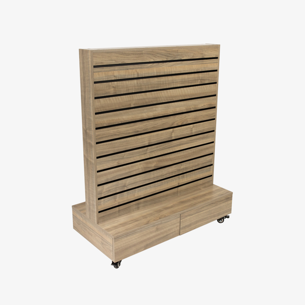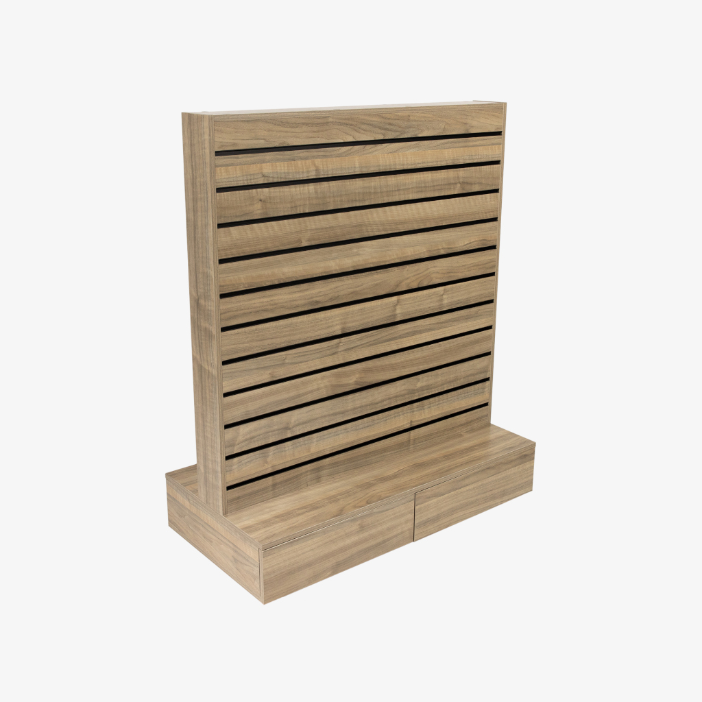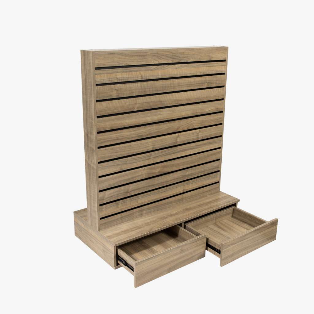 Upgrade your retail environment with our sophisticated and versatile Double-Sided Center Bay Walnut Slatwall Gondola, now featuring convenient drawers for enhanced storage solutions. This freestanding unit is a perfect match for various retail settings, including luxury boutiques, functional hardware outlets, convenience stores, contemporary pharmacies, fashion retailers, and boutique grocery markets. Its elegant walnut finish ensures your products are showcased with warmth and sophistication, capturing the attention of your customers.